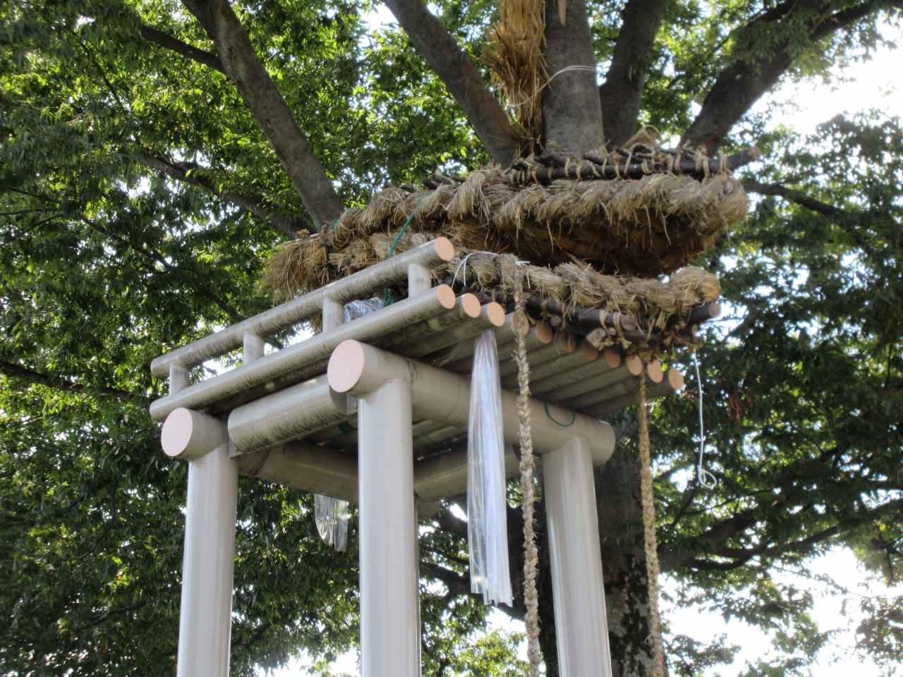 出来上がった蛇の頭を櫓の上に置き、蛇の胴を大欅の幹に巻き付けます。