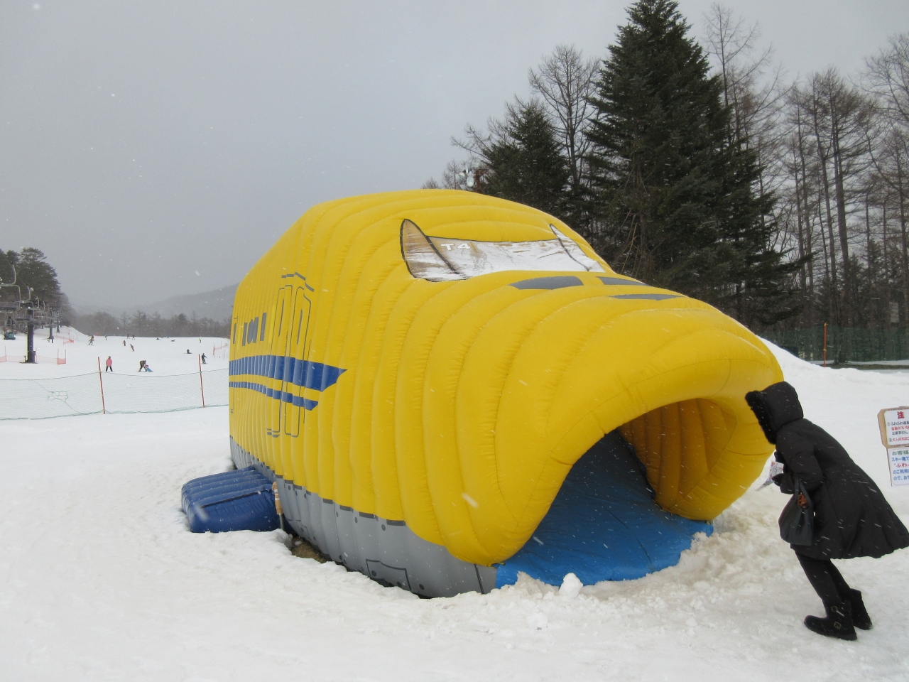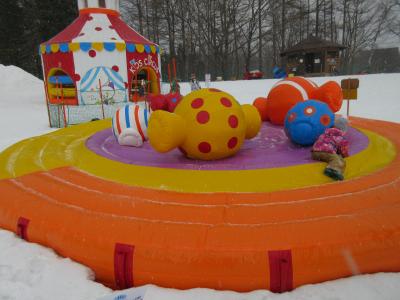 全てがエアーバルーンでできた巨大な家や、滑り台や、跨がれる動物(もちろんバルーン製)などがたくさんあります。家の中でフワフワと跳ねたりするだけでも、子どもは喜びます。それが飽きたら、親子でソリ滑りをしたり、雪だるまを作ったりと、子どもはいつまでも飽きません。上に行くときは「スノーエスカレーター」で、安全に楽々と行けます。