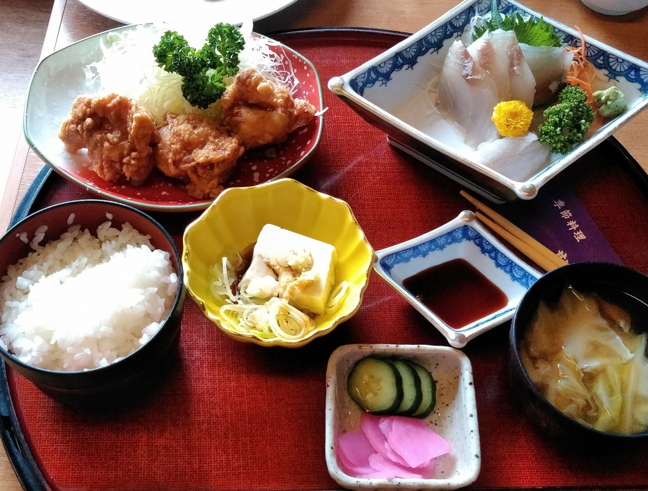 『おすすめ本日の日替わりランチ』(900円)は、コチの刺身と、鶏の唐揚げ、冷や奴の小鉢、漬け物、キャベツのみそ汁とご飯。