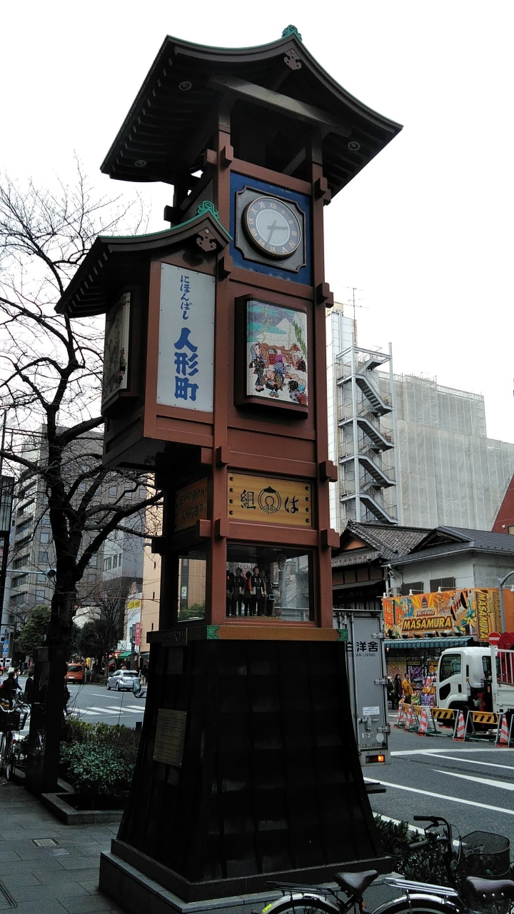 人形町のメインストリートの歩道に大きなからくり時計の櫓が建っています。私が見つけたのは、「町火消しからくり櫓」です。