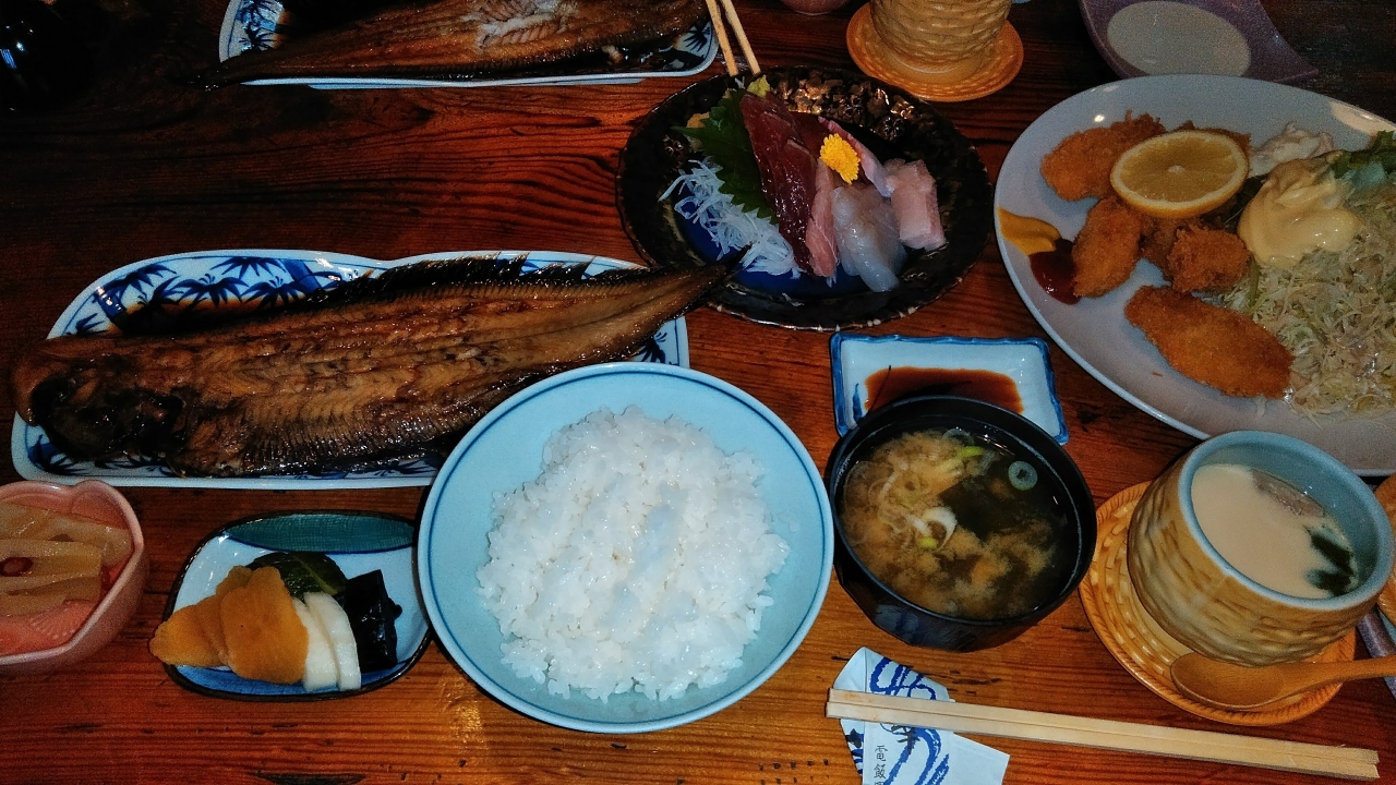 刺身の盛り合わせ、牡蠣フライ、へらの煮付け、茶碗蒸し、それにご飯と漬け物にみそ汁を注文。