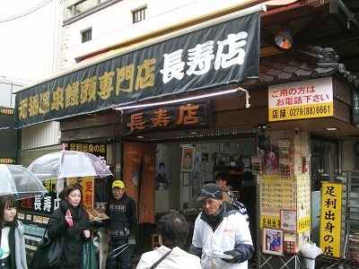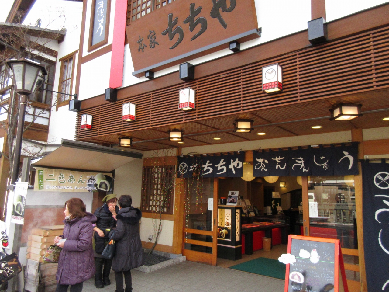 湯畑の目の前にある温泉まんじゅう屋さんです。ここで買って、目の前の足湯所に足を浸けて、まんじゅうをいただくと、雪の降る真冬でも幸せです。