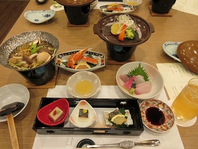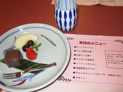 1階のレストランでの夕食は、和洋折衷のフレンチコースで、前菜、魚料理、肉料理、デザートまで、どれもとても美味しかったです。