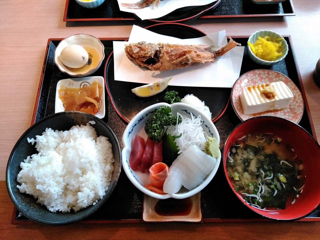 お刺身は新鮮で量も多く、仮にカサゴの唐揚げがなくても、「刺身定食」と言えるほどの満足感でした。