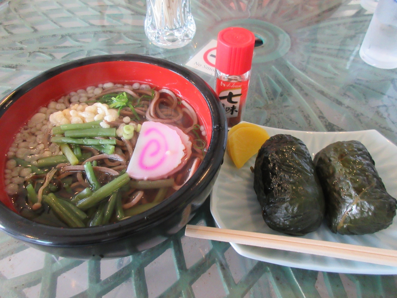 たくさん歩いた後に、お店で「おそばと『めはり寿司』2個セット」(800円)をいただきました。おそばの出しは優しい味で、高菜漬けに包まれた『めはり寿司』もとても美味しかったです。