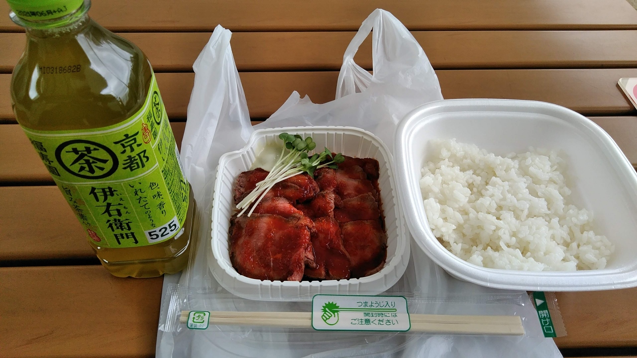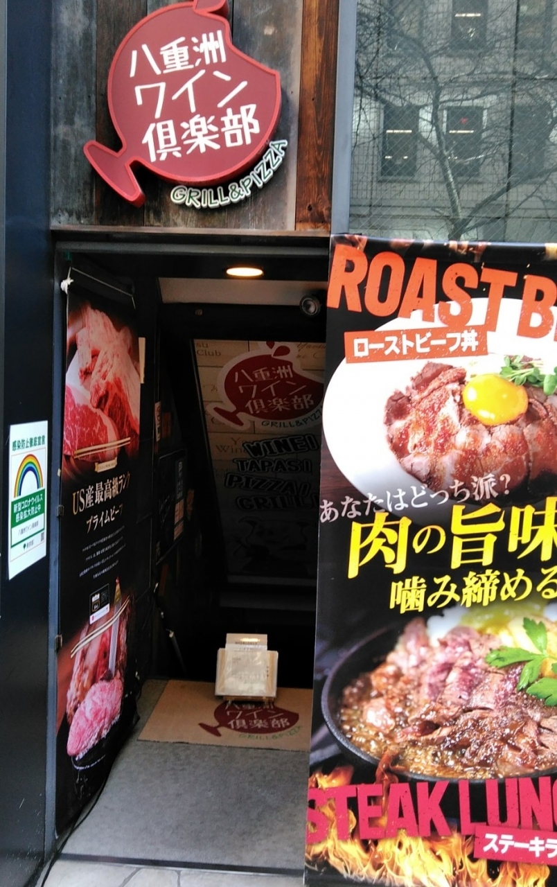 東京駅八重洲口から徒歩数分の路地にあります。地下1階で、隠れ家的なステーキとワインのお店ですが、ランチタイムのテクアウトのみですが、たった500円で『ローストビーフ丼』が食べられます。しかもペットボトルのお茶「伊右衛門」がサービスで1本付いてきます。