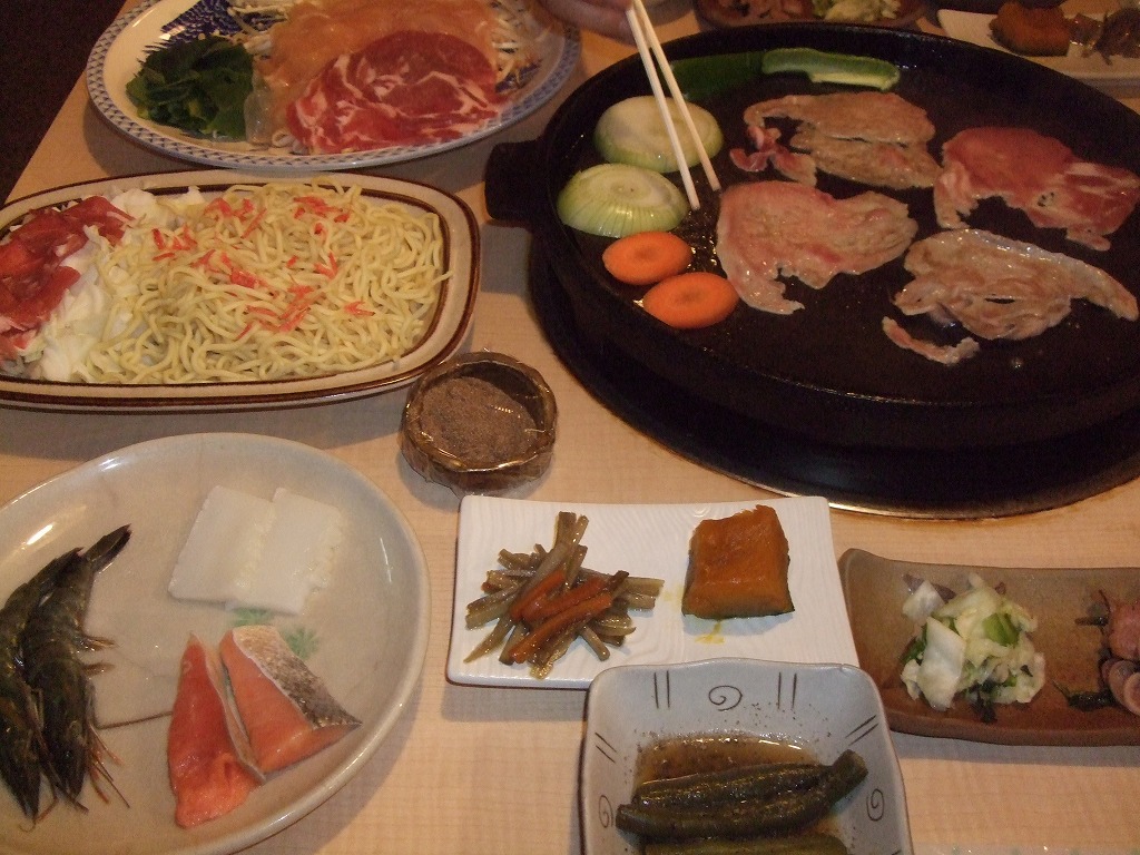 夕食は、豚肉と鶏肉、野菜、焼きそばなどの鉄板焼きを中心に、いくつか酢の物、煮物、焼き物がついていて、かなりボリュームがありました。