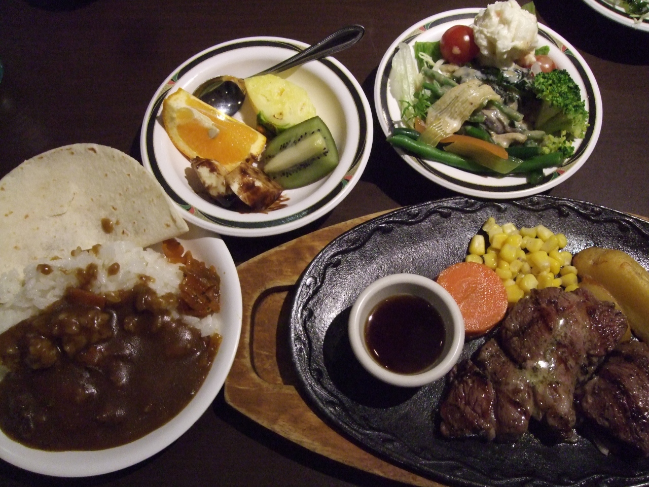 牛肉ステーキかハンバーグをオーダーすれば、ライス、カレー、サラダ、フルーツ、スープなどの副菜は食べ放題です。