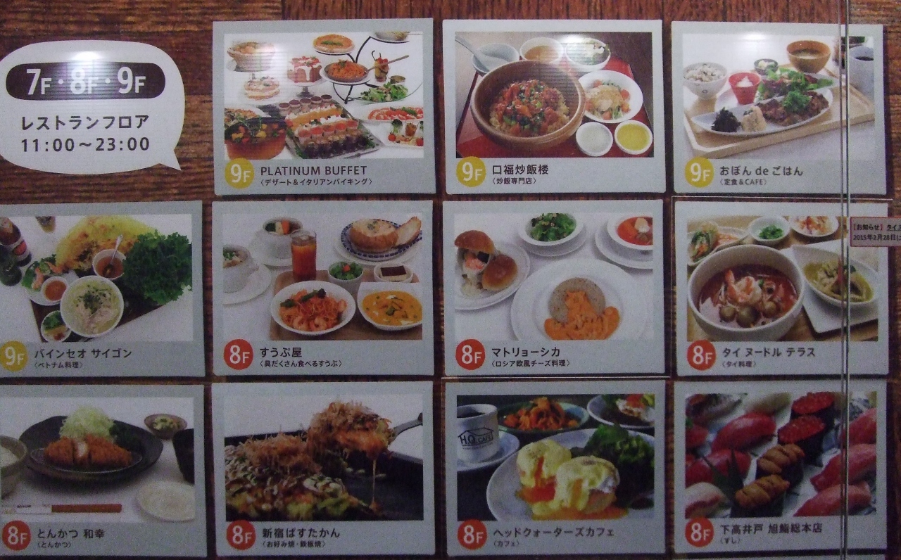 7~9階のレストラン&カフェのフロアには、らーめん山頭火、とんかつ和幸、寿司店、オムライス店など、バラエティに富んでいて、個人的なお薦めは、PLATINUM BUFFETというデザート&イタリアン・バイキングのお店です。リーズナブルに、美味しい料理をいただけます。- 旅行時期
