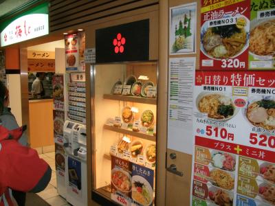 通路に面して食券の自動販売機があって、うどん、おそばの他に、丼物などの種類も多く、セット物もあって、どれもかなりリーズナブルな料金設定です。立ち食いそば店のようでありながら、椅子もあって、落ち着いて食べられます。