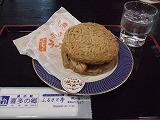 地元産の麺を焼き固めてバンズにして、間にチャーシュー、シナチク、ナルト、刻みネギも挟まっていて、味付けはまさにラーメンの味。