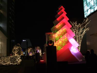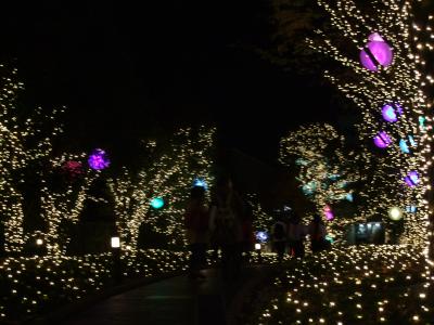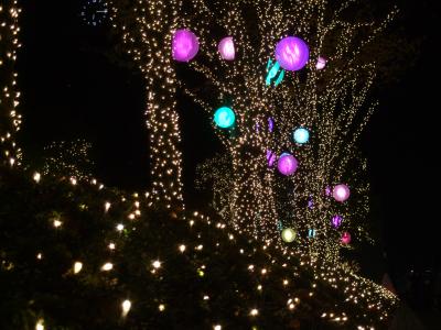 木々には小さな温かい色のイルミネーションがたくさん点いていて、大きなボール状のカラフルな電飾がアクセントになっています。