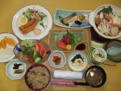 食事は料金別に各コースがあって、下から2番目の「妙義コース」では、海鮮・キノコ鍋(うどん入り)、お刺身、エビフライなど、8品位のお料理に、キノコご飯、けんちん汁など、どれも美味しかったです。