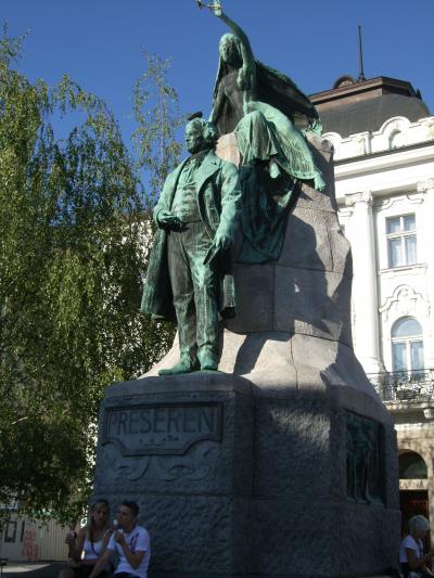 リュブリャーナの中心にある広場で、スロベニア国歌の作詞者フランツェ・プレシェーレンの銅像が建っています。