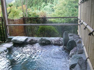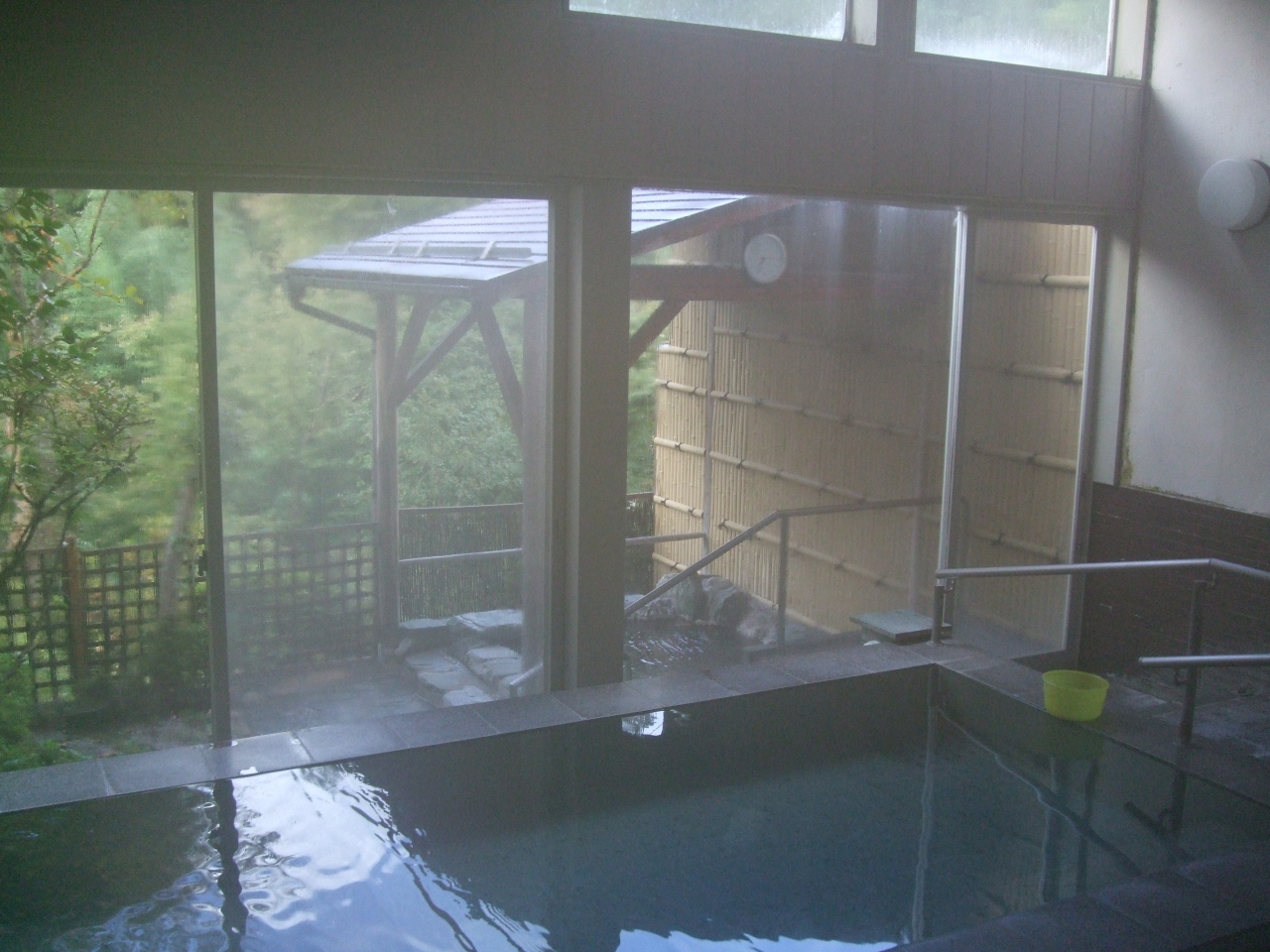 山荘風の建物です。300年の歴史がある源泉の掛け流しで、100%天然温泉というのがうれしいです。大浴場は総檜風呂で、露天風呂は岩風呂になっていて、とても広くて、周囲の景色を楽しみながらのんびり過ごせます。