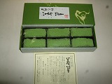 松江藩城主にも茶事に使われたという銘菓『若草』は、抹茶で包まれた求肥(ぎゅうひ)です。表面の抹茶も中の求肥も味が濃くて、食感はわらび餅のように柔らかくて、抹茶に良く合いそうです。苦めの飲み物と良く合いそうなので、私は珈琲と一緒に味わいました。