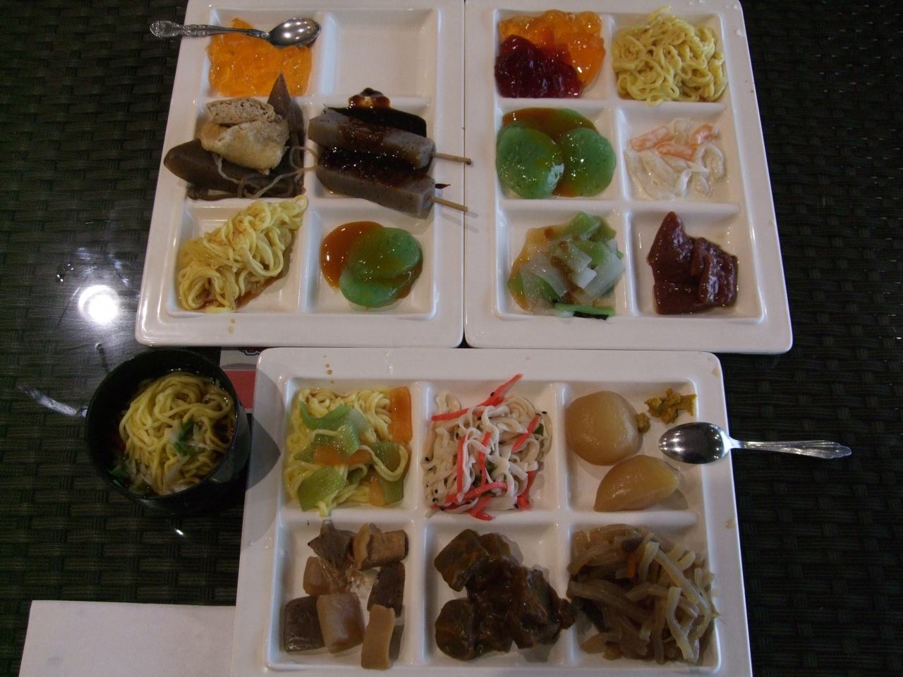 1階に戻って、奥に行くと、珍しいこんにゃく料理を無料食べられる試食コーナーがあります。30種類くらいのこんにゃく料理が並んでいて、好きなものを好きなだけトレーに取って食べることができました。こんにゃくカレーやこんにゃくラーメン、稲庭風うどん、冷やしラーメン、玉こんにゃく、おでん、こんにゃく田楽、フルーツゼリーなど、珍しい調理がされたものも多くて、お腹がいっぱいになりました。
