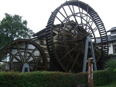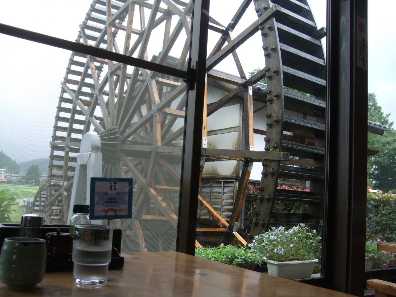 直径12mの巨大な水車と直径6.5mの水車が回っています。その回転によって石臼で挽いたおそばは隣の「お食事処水車館」で食べられます。一番人気の『伊王野水車天ざるそば』1070円は珍しいです。そばの実がまだ若いうちに刈るので、緑がかった色をしています。3種類の野菜の天ぷらに抹茶ソルトが良く合います。11時の開店前から行列が出来ます。