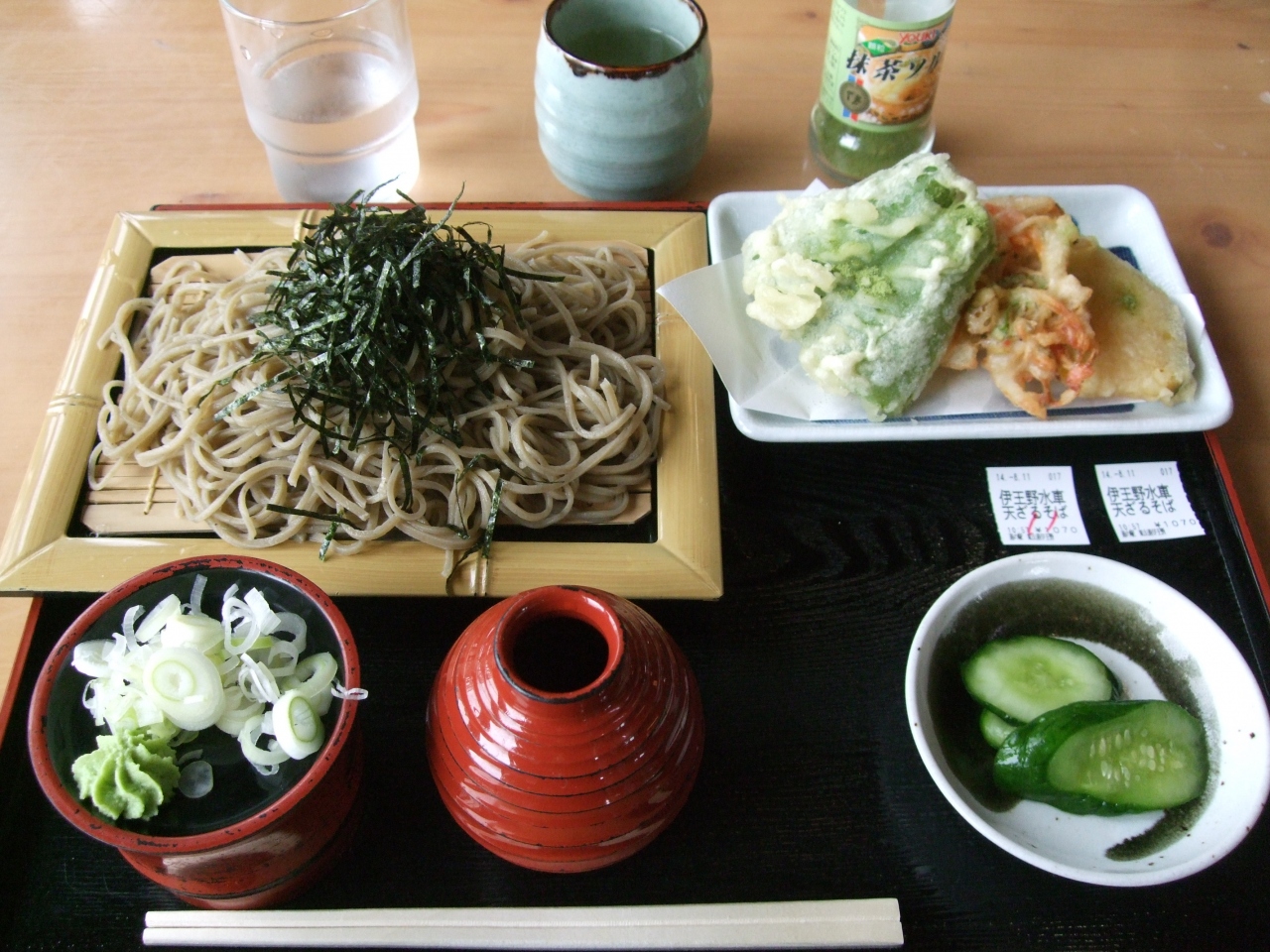 大水車で石臼引きのそばの中でも限定『伊王野水車天ざるそば』(1070円)を頼む人が多いです。そばの実がまだ若いうちに刈るので、緑がかった色の珍しいそばです。3種類の野菜の天ぷらに抹茶ソルトが良く合います。ちゃんとそば湯も出ます。