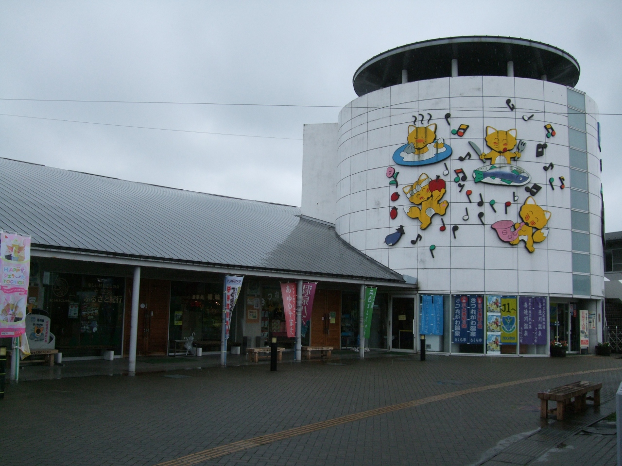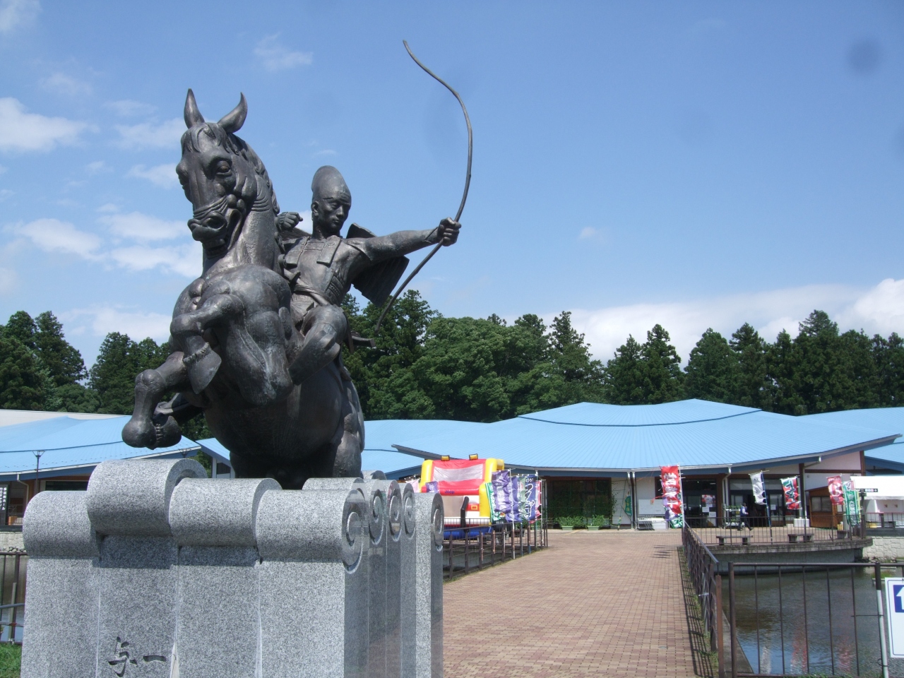 「レストラン館」「農産物直売館」「加工・物産品館」「情報館」の他に、「那須与一伝承館」も併設しています。敷地の中央には扇形の大きな池、その前に那須与一騎馬像が建っています。