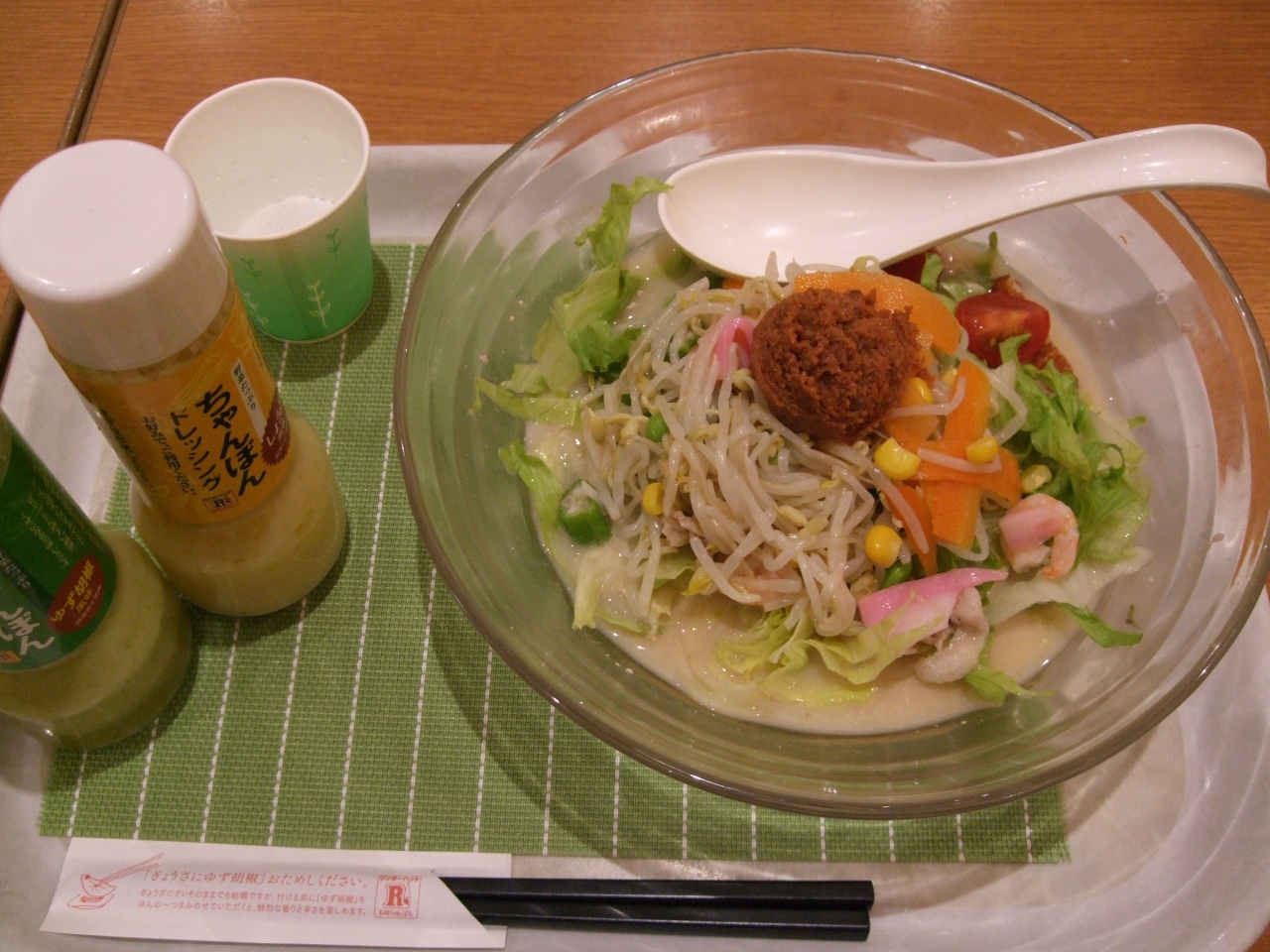チャポンは熱いしな、と思っていたら、『冷やしチャンポン』のポスターを見て試してみました。本当に野菜たっぷりで、レタス、コーン、枝豆、オクラ、ニンジンなど、種類も多かったです。さっぱりした豚骨スープに、具の上に挽肉混じりの味噌だれ(?)も乗っていて、食べている途中にそれを混ぜて食べるとコクが出て美味しく食べました。さらにトレイにリンガーハット特製の「チャンポン用しょうがドレッシング」と「チャンポン用ゆずドレッシング」の2種類のボトルを乗せてくれて、それも食べている途中に、レンゲに具をのせながらそれを順にかけて食べると、色々な味を楽しめました。