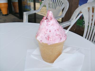 農産物直売所の『なつおとめジェラート』(350円)は、冷凍イチゴ丸ごとを砕きながら混ぜてくれます。