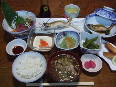 夕食は名物の鮎の塩焼きと甘露煮、馬刺し、ふぐの唐揚げ、ゆばのとびっこ乗せ、刺身こんにゃくなどを個室で食べられます。