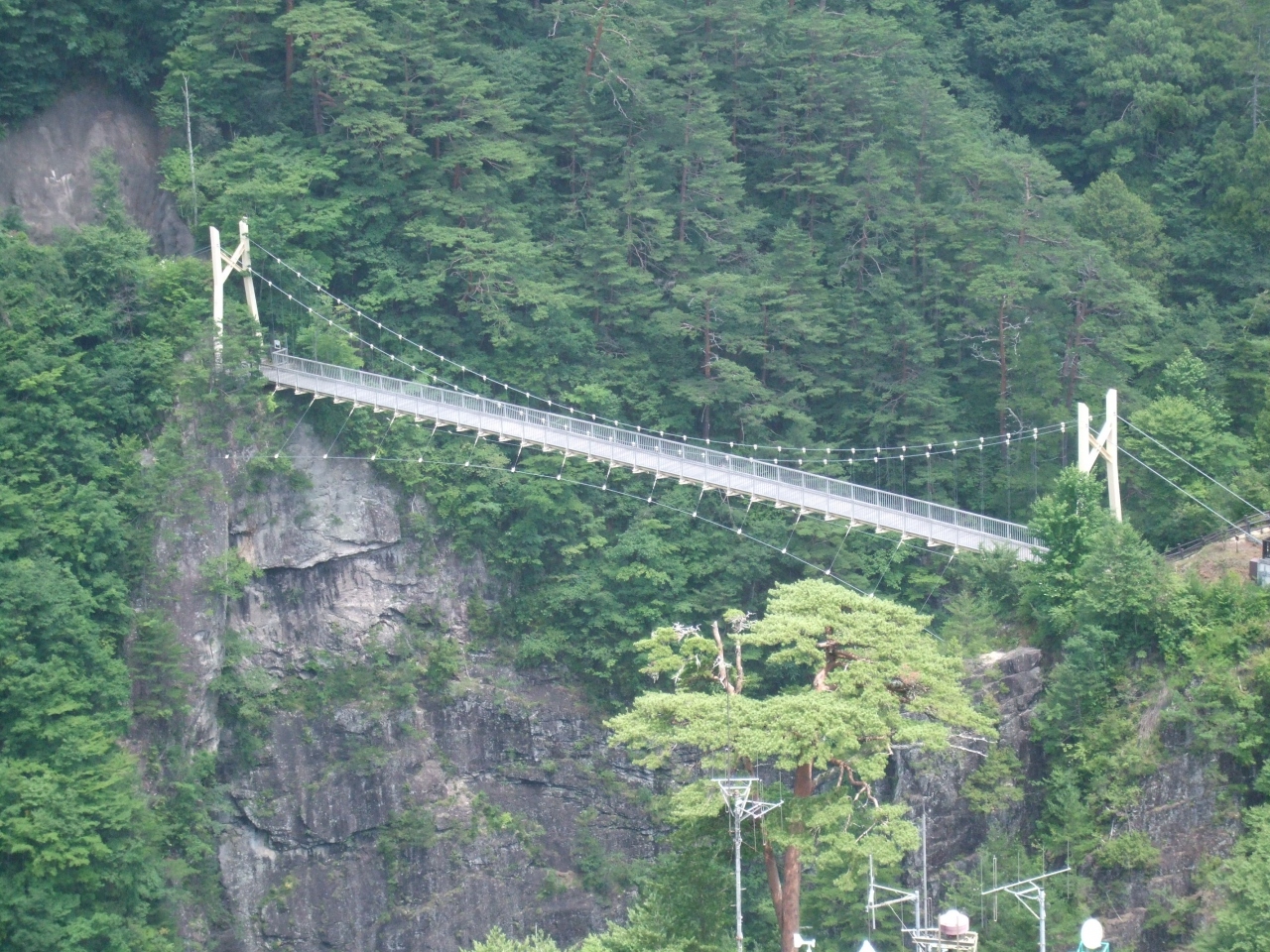 川俣ダムから流れ落ちる水が流れる川に沿って、周囲に険しい岩と山々の新緑が目に鮮やかで、わたらっしゃい吊り橋から360度のパノラマが広がります。特にお薦めは、10月下旬の色鮮やかな紅葉の時期です。
