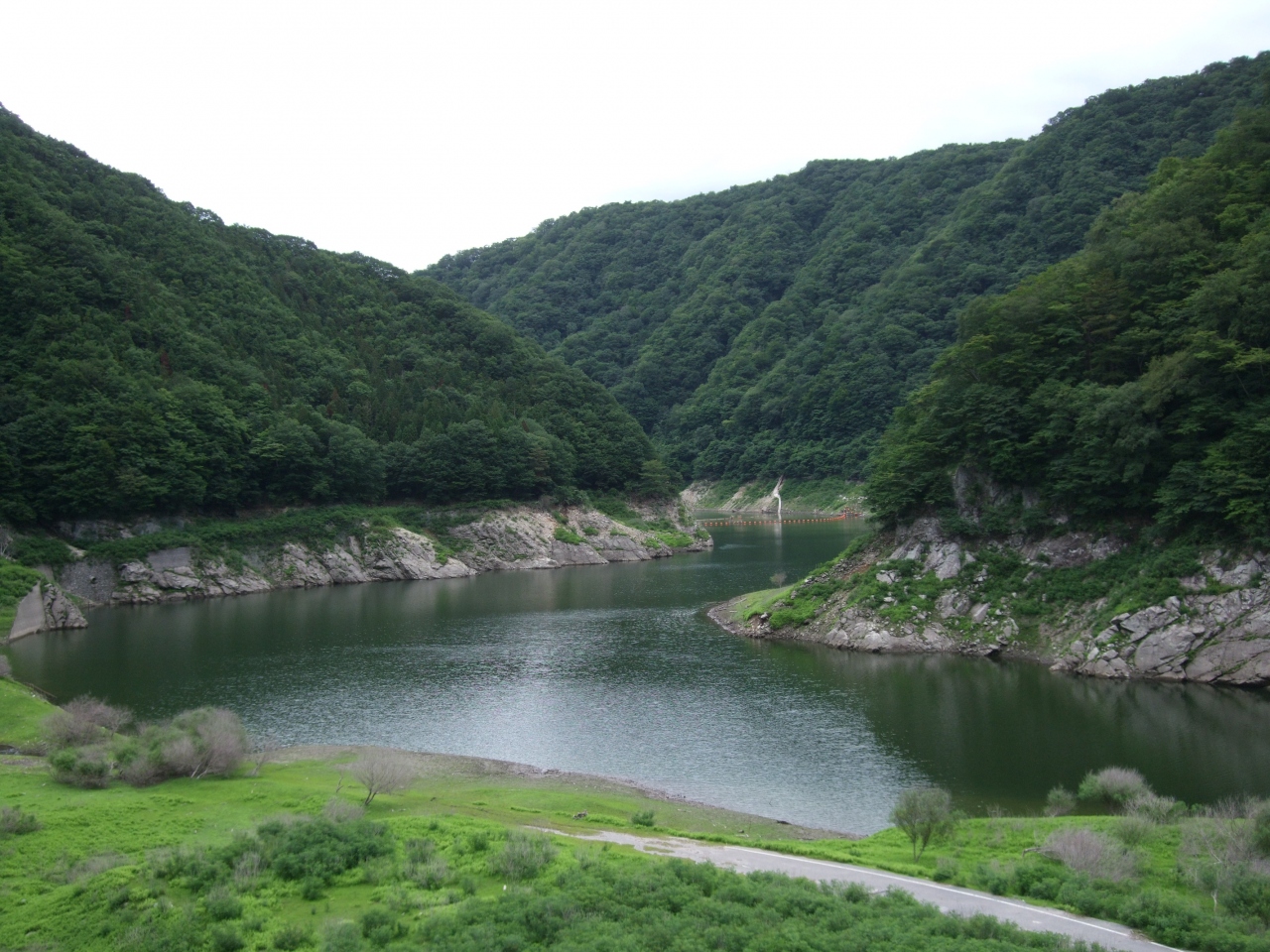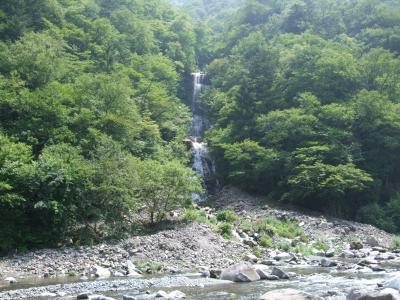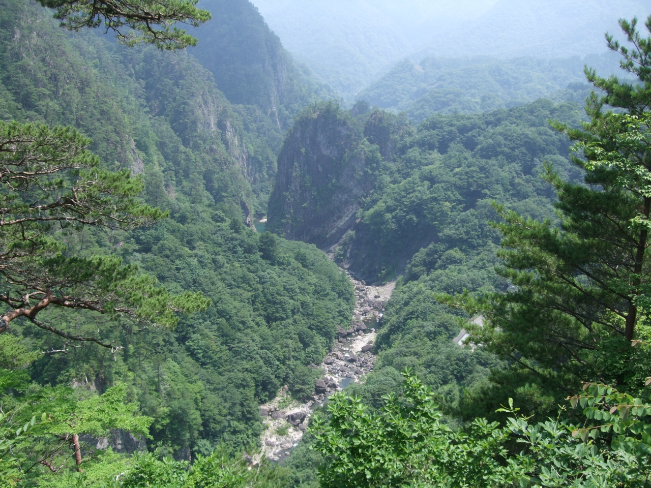 川俣湖の水が、川俣ダムから流れ落ちて作る川を挟んだ周囲の山々の新緑が目に鮮やかで、険しい岩が秘境を感じさせます。寒暖の差が激しいことと、常緑樹よりも広葉樹が多いので、10月下旬の紅葉の時期は、鮮やかな葉の色づきが鮮やかになります。