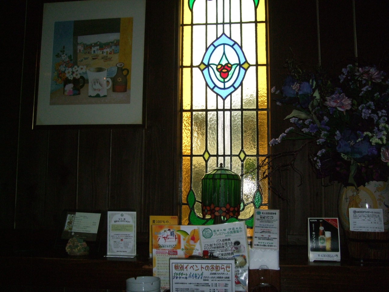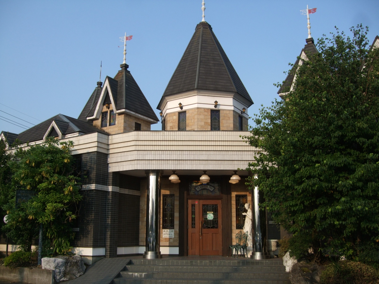 国道4号パイパス沿い(上り車線)にあります。陸橋の下にあります。尖塔のある中世の洋館風の建物が目立っています。店内は、個室風に仕切られていて、とても落ち着きます。窓には、ステンドグラスを通した光がロマンチックな雰囲気にしています。