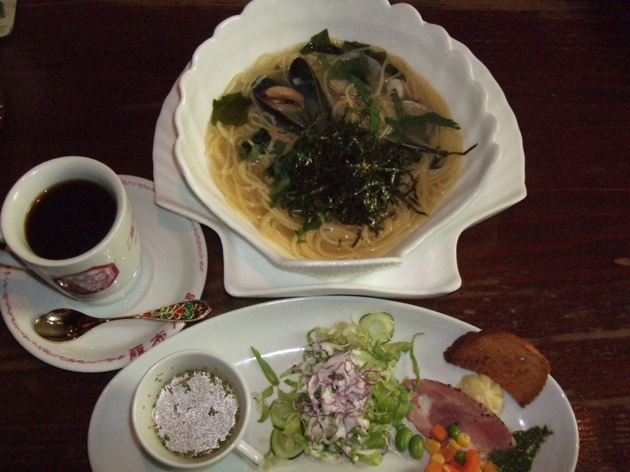 「シェフのおすすめセット」(1590円)は、10品以上のメインディッシュから『海の恵み旨味スパゲッティ』を選んで、ドリンクは『(マグカップに入った)ブレンドコーヒー』を選びました。それにポタージュスープ、サラダ、前菜盛り合わせが付いています。