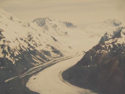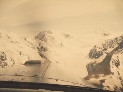 セスナ機で、山頂付近の氷河の上に着陸しました。氷河上から見渡す限り、氷河に覆われたの山々を眺めているだけでも悠久の時の流れを感じました。氷河の上を散歩できて、感動しました。