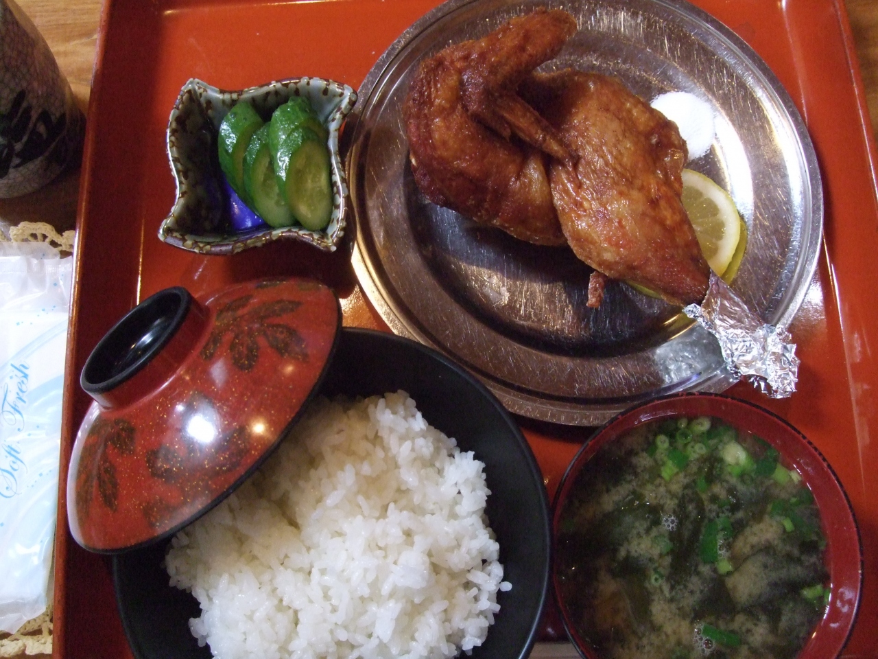 鶏のから揚げしかありません。単品が1050円。定食だとご飯、味噌汁、漬け物がついて1500円です。「たかが鶏の唐揚げで1050円!?」と思いましたが、見てびっくり! 鶏の2分の一羽がそのままから揚げになっていました。相当お腹が減っていないと、1人では食べきれません。塩味の他に、企業秘密の下味をつけているそうです。味も良いし、揚げ具合もちょうど良くて、じっくりと中まで火が通っていて外はかりっとして、中はジューシーな理想の状態でした。値段に見合う1品でした。