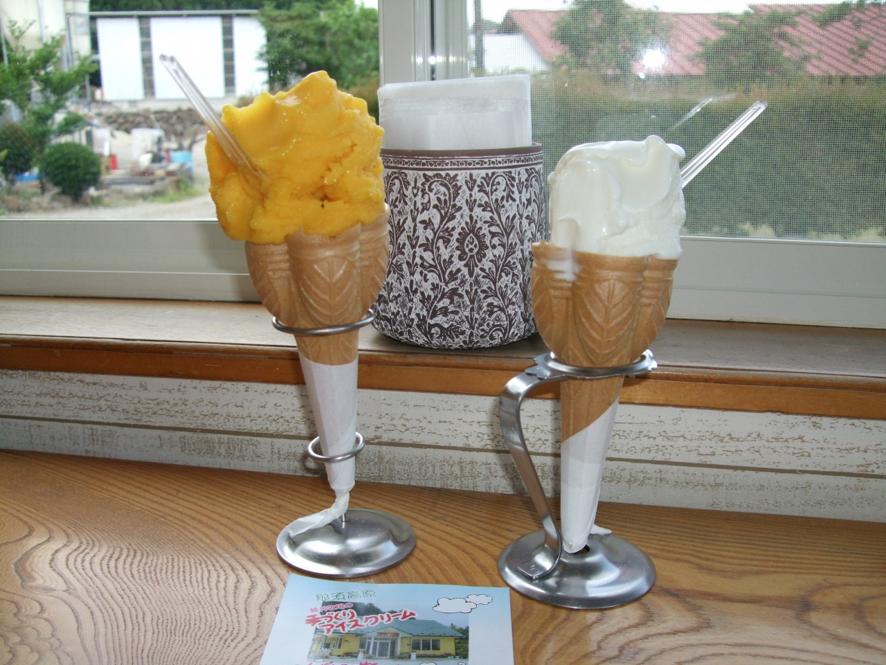 桃井牧場で絞りたての牛乳を使った、手づくりアイスクリームのお店「アイス工房ももい」に立ち寄りました。10種類以上のアイスクリームや、コーヒーなどのドリンクもあります。