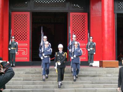 衛兵交代式は、中正紀念堂など各所で行われていますが、ここの交代式が一番見応えがあります。交代式は、毎時間ちょうどに行われて、邪魔をしない限り、横に並んで写真を撮っても大丈夫でした。