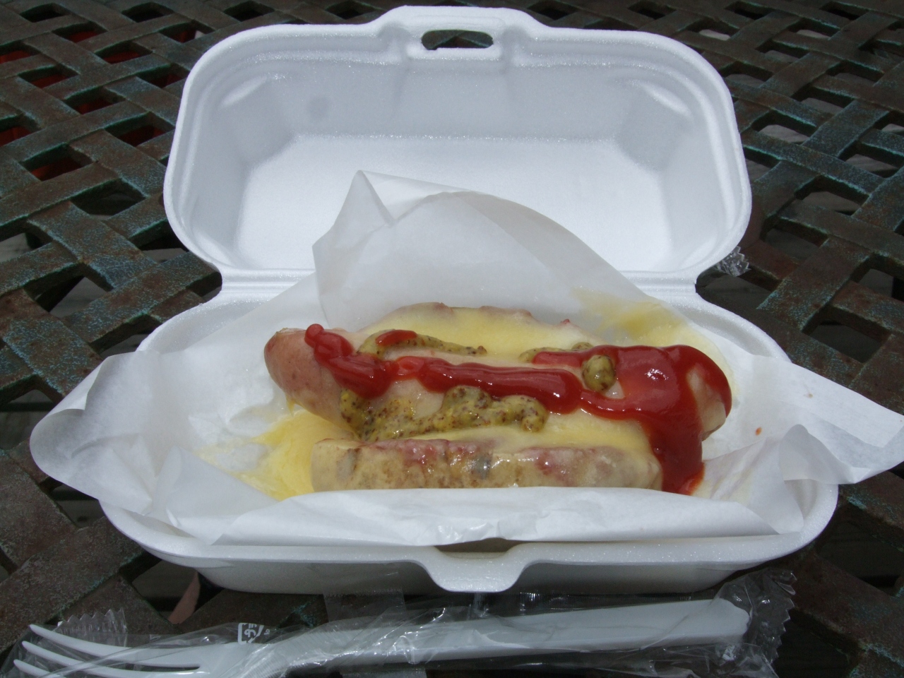 『ジャーマンポテト』がお気に入りで、大きなジャガイモをホットドッグのパンの代わりにして、切れ目に自家製ソーセージをはさんであります。それにチーズがたっぷりのっています。溶けたチーズとスパイスの効いたソーセージとジャガイモがとても良く合います。立ち寄るときは、毎回そこで食べて、さらにおみやげにも買って帰ります。- 旅行時期