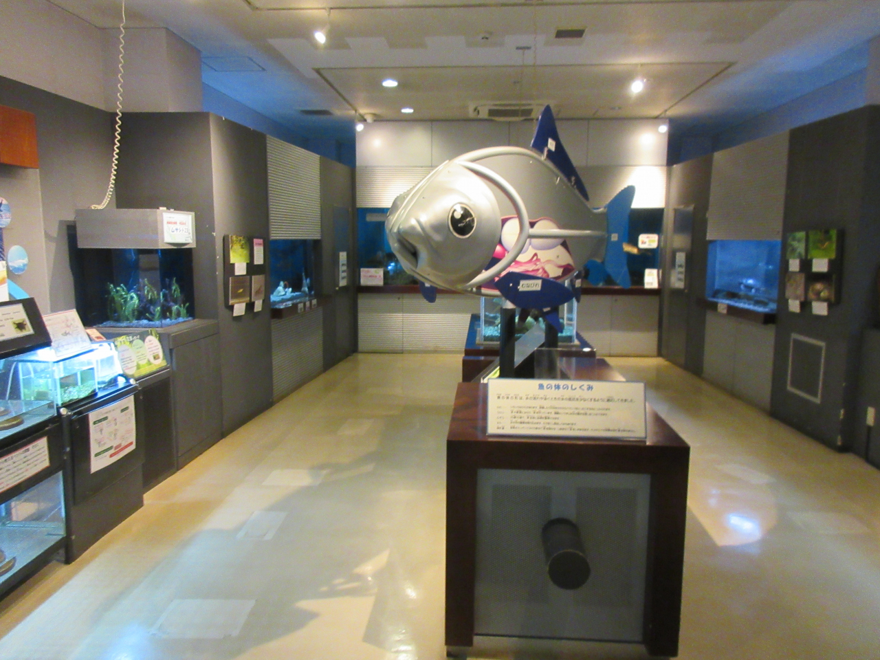 1階「水中のふしぎ」には、コイ科のオイカワやアオウオ、絶滅危惧種で埼玉県の魚ムサシトミヨなどが展示していました。