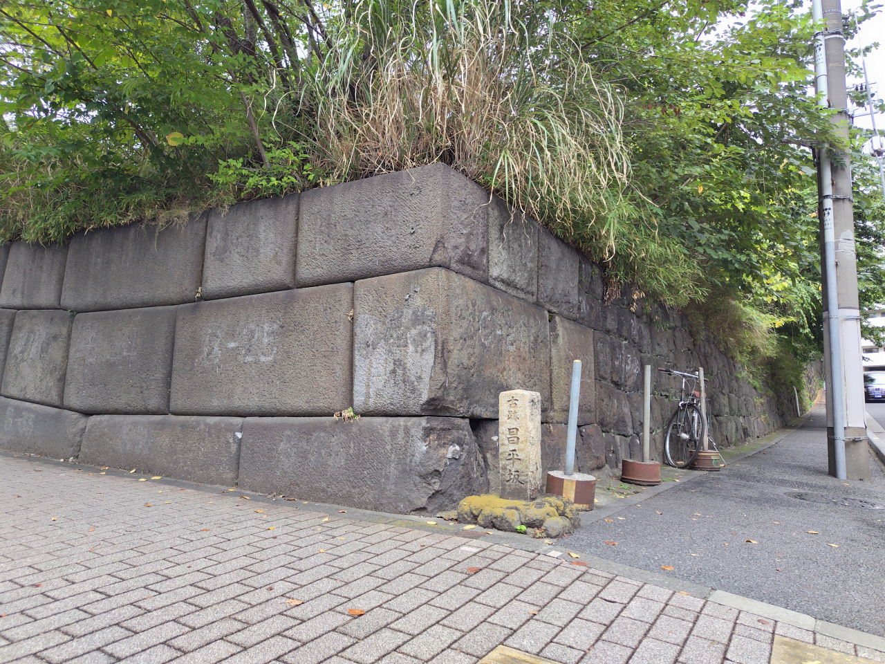 都道405号線(外堀通り)に面した正門の横に昌平坂の石碑があります。「昌平坂学問所」の名になった坂道です。