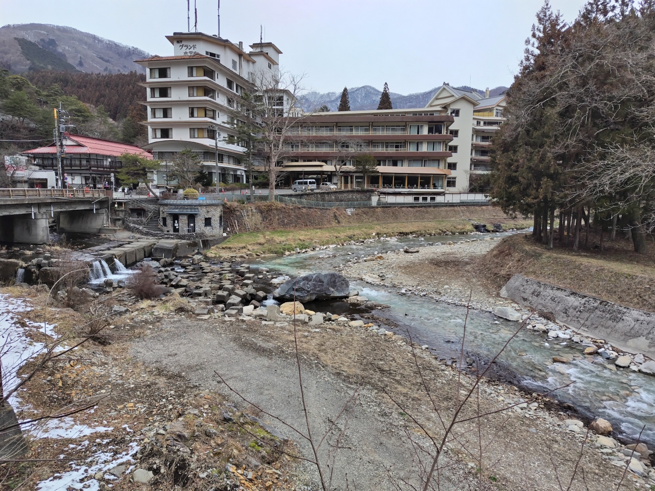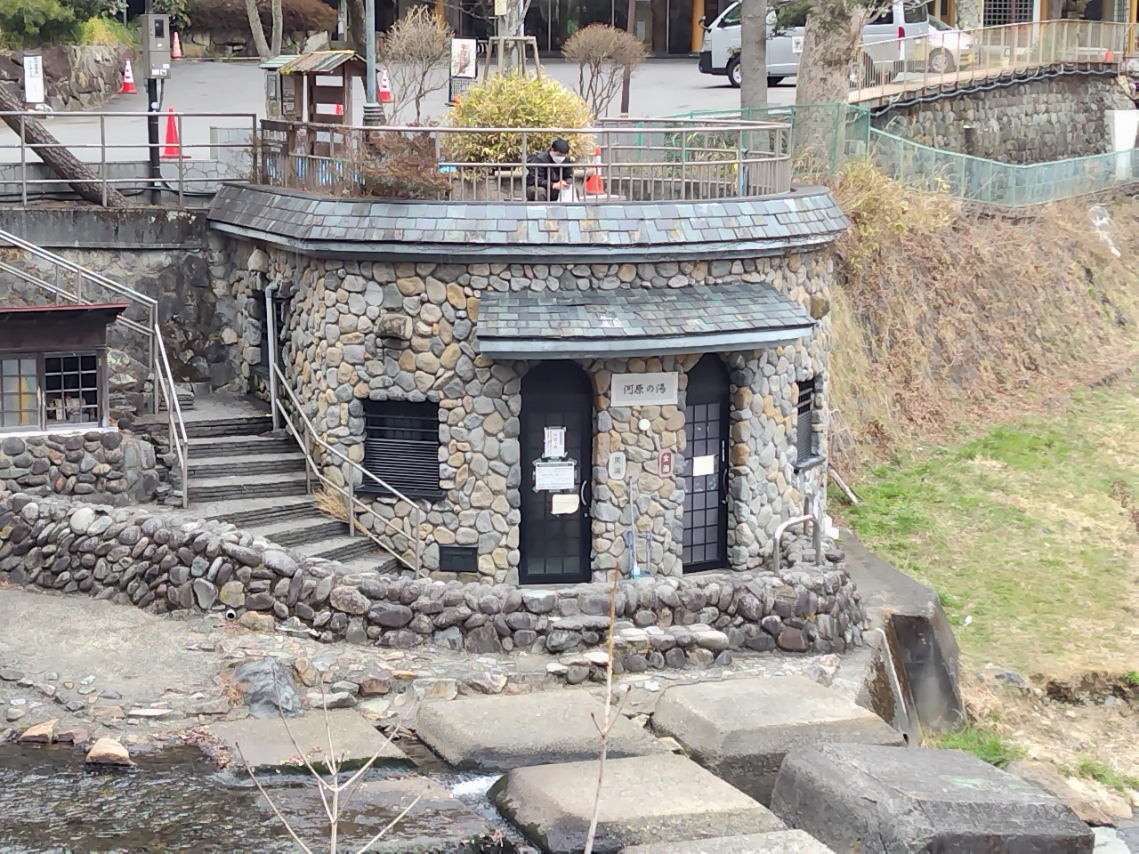 ひとつは、温泉街の入り口にあたる、四万川と新湯川が合流する所に共同浴場の「河原の湯」があります。まさに河原にあって、石造りのその景色は四万温泉の代表的な写真に使われています。
