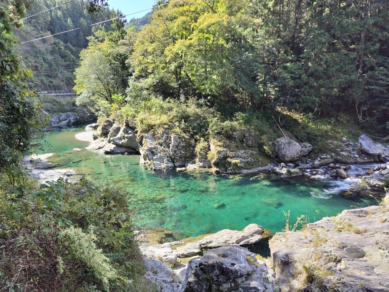 高知県の嶺北という地方についてはあまり取り上げられないですが、早明浦ダムの手前から、吉野川の支流、汗見川沿いの県道264号線(坂瀬吉野線)を愛媛県境に向かって進むと、とても水の色が神秘的で美しい渓谷が続きます。