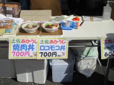 嶺北地方特産の食材を使った食べ物がたくさん屋台に並んでいました。中でも希少な「土佐あか牛」を使った「土佐あかうし焼肉丼」を食べました。