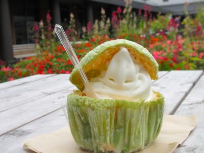 去年あった『空飛ぶメロンパン』が見当たらなくてスタッフに聞いたら、時期的に終わったそうで、代わりにポスターで新たな『メロンパンソフト』を見たので、それにしました。