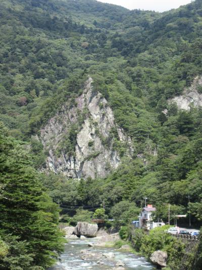 国道400号線の途中で箒川の上流を見ると、正面に天狗岩がそびえています。絶壁の岩が巨大で、その迫力がよくわかります。