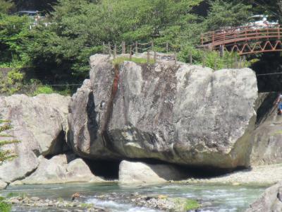 天狗岩の下の箒川をよく見ると、大きな岩があります。「野立岩」といって、人が100人立てると言われる大きな岩です。