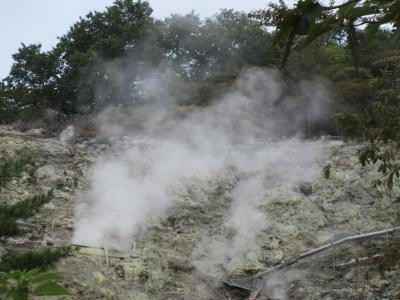 近くに「中の湯」源泉が吹き出す蒸気が見える場所があります。「有毒ガスに注意!立ち入り禁止」の表示があります。