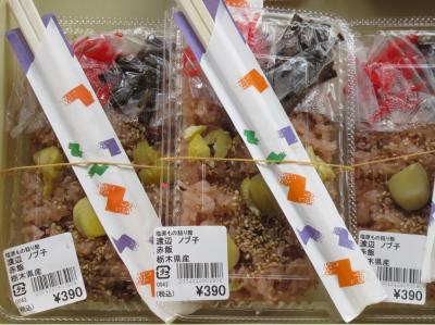 左にたまり漬けの厚切りポークハムは地元に工場がある丸大ハム。