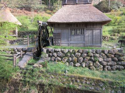道の駅ゆすはらに隣接する太郎川公園に、茅葺き屋根の水車小屋や茶堂がありました