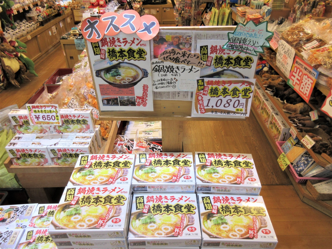 新荘川にかつていたかわうそのイメージキャラクター「しんじょう君」関連商品や、須崎名物、日本一熱いご当地ラーメン!「鍋焼きラーメン」のお土産もあります。