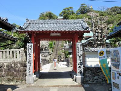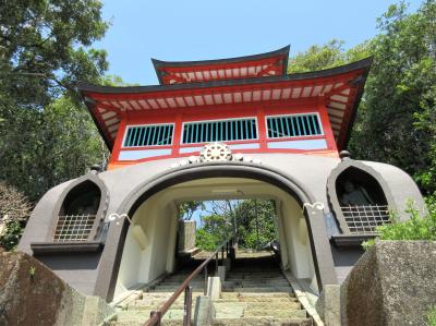 125段ある急な石段の途中にある、竜宮城のような朱色の鐘楼門兼仁王門が印象的