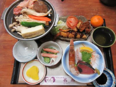 食事会場の席は決めておらず、空いているところで勝手に食事をするようです。しかし空いていた席は、先ほどのお風呂を独り占めしていた方の前しか空いていなくて、しばし部屋に戻って時間をつぶしてから行ってすっかり冷えた食事をいただくことになりました。